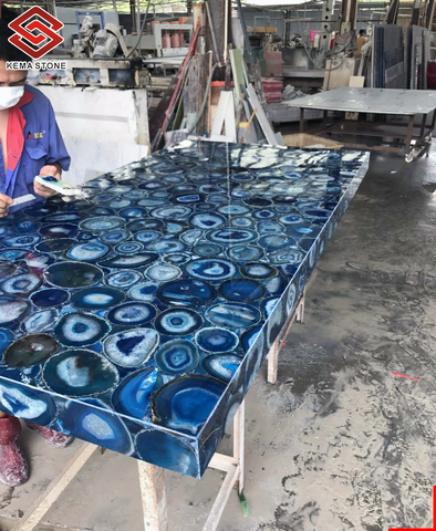 Luxury Aqua Blue Agate Slice Slab Brazil Gem Stone Translucent Surface Composited Glass Hotel Backlighting Wall Natural Stone